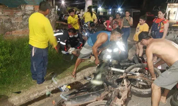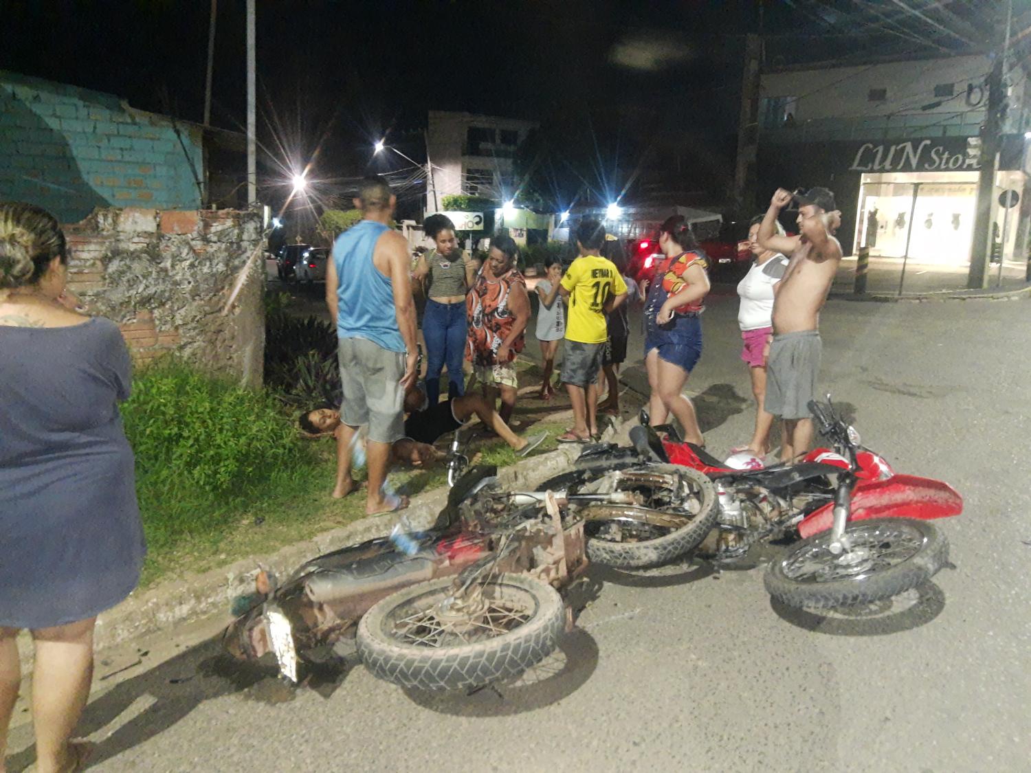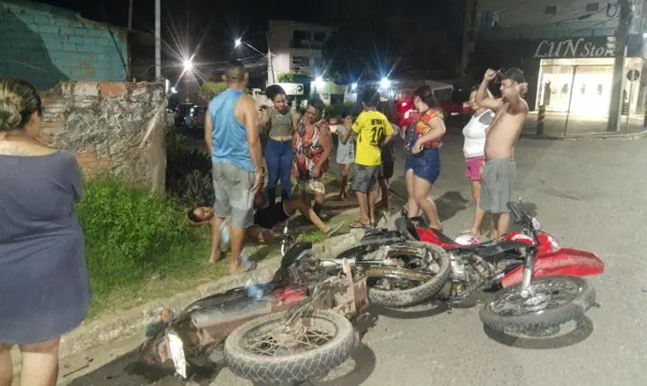 Agora pouco noite de Quinta feira (25) batida entre duas motos na Bartolomeu com Moraes Sarmento bem no canto . Duas motos envolvidas no sinistro , em uma das motos uma mulher que estava em uma Bros de cor vermelha, em outra moto dois rapazes .