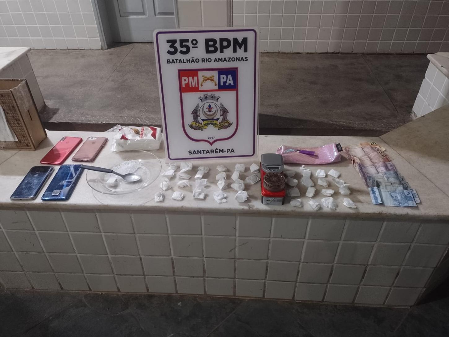 Foi encontrado no local vinte e duas (22) Trouxinhas de uma substância de Maconha; dezesseis (16) Trouxinhas de Cocaina; um (01) prato com restos de uma substância tipo Cocaina e outros objetos.