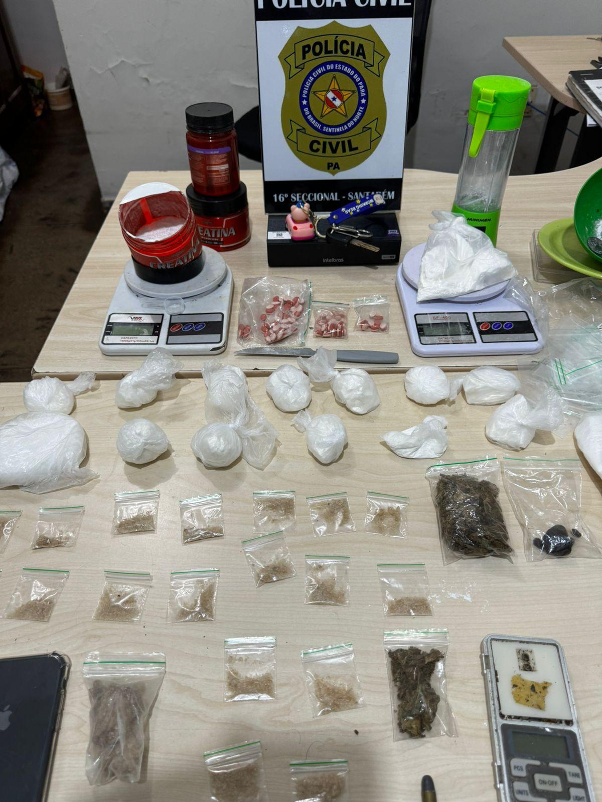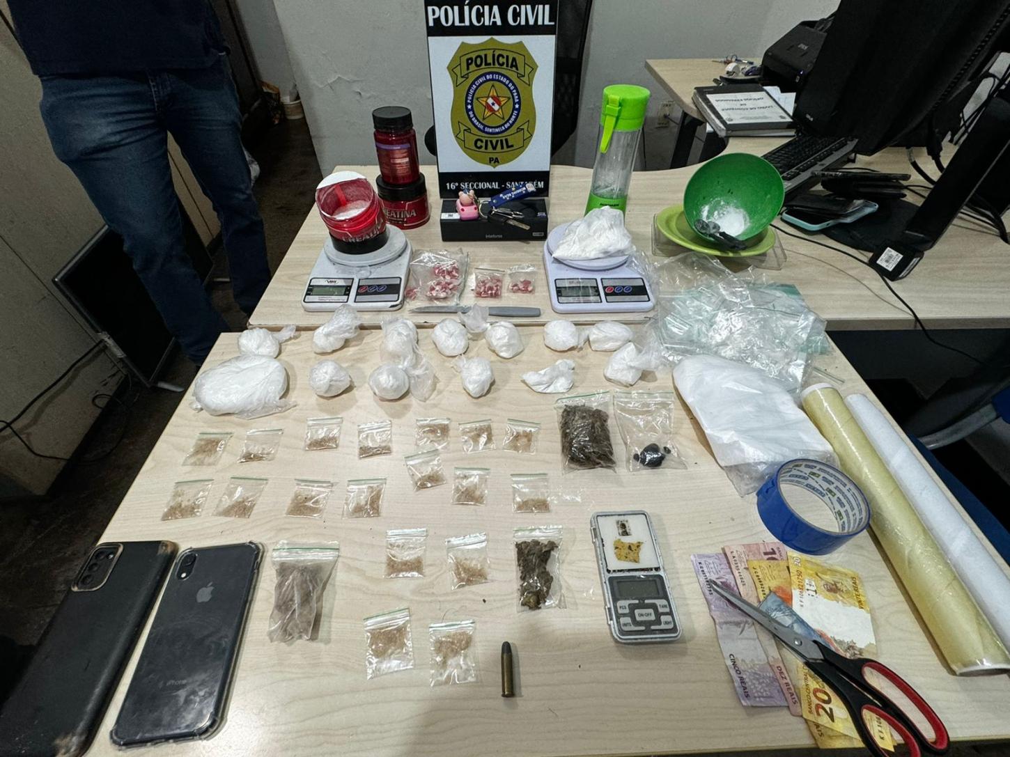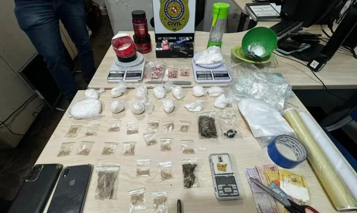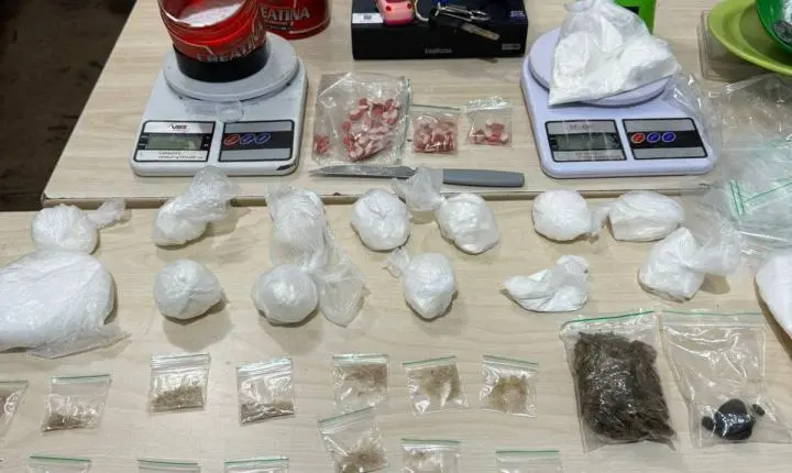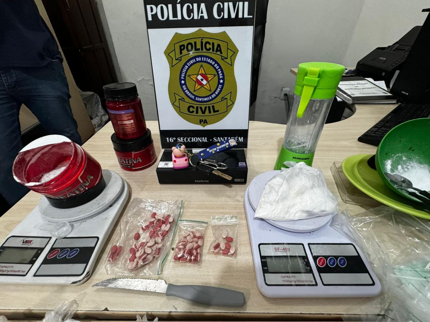 Erick Mateus também foi abordado em seu veículo portanto entorpecentes. Na residência de Erick Mateus no bairro Jardim Santarém também foi encontrado bastantes drogas em vários tipos como, Excstase, Haxixe, Maconha, Crack e Cocaína, bem como, diversos outros objetos utilizados para transformar, pesar e preparar os entorpecentes. Os dois indivíduos, a droga e os objetos foram apresentados à Autoridade Policial Plantonista da 16ª Seccional de Policia Civil Delegado Fábio Amaral para tomar as providências cabíveis.