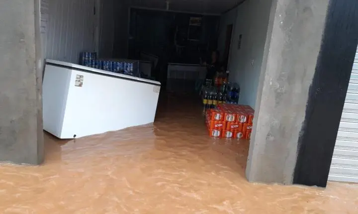 A chuva forte alagou comércios e deixou os proprietários em uma correria no sentido de proteger seus bens.
