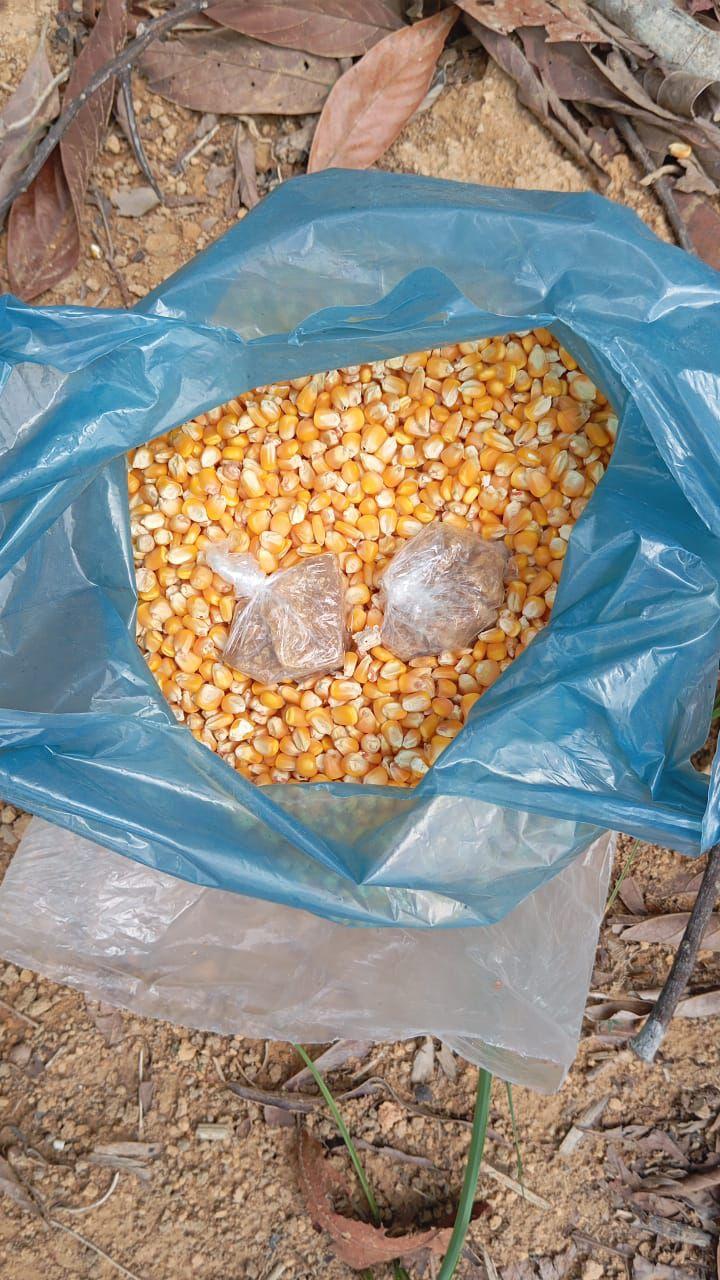Durante a abordagem, foi ao verificar os objetos que o suspeito carregava, os policiais localizaram duas porções de substância semelhante ao crack, escondidas dentro de uma saca de milho, em seguida nas buscas, foram encontrados materiais ilícitos e diversos objetos sem comprovação de procedência.