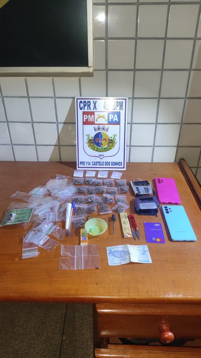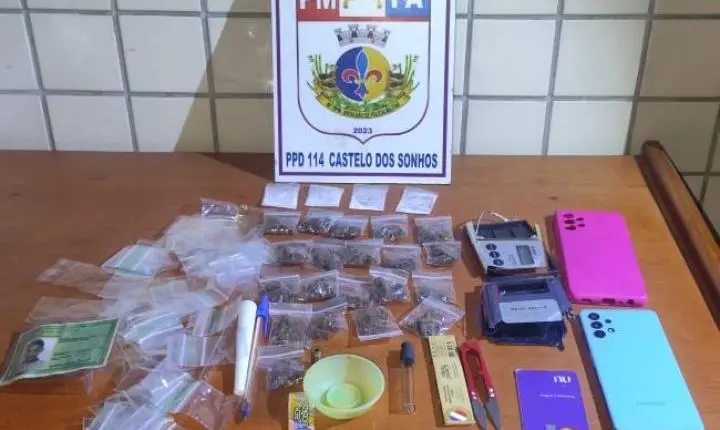 Noite do dia 31 no Distrito de CASTELO DE SONHOS localizado na BR 163 no município de Altamira uma guarnição da PM em rondas pela cidade, por volta das 23 : 10 Horas durante a "Operação Tolerância Zero" a guarnição recebeu informações de que indivíduos estariam comercializando substâncias entorpecentes nas proximidades de um estabelecimento comercial situado na Avenida Santo Antônio. Munidos de informações os policiais se deslocaram para checar a informação e já no local foi visualizado uma movimentação onde um dos suspeitos, ao perceber a aproximação da viatura policial, realizou movimento brusco, dispensando objetos que trazia em sua posse, circunstância que ensejou fundada suspeita, nos termos do art. 244 do Código de Processo Penal.