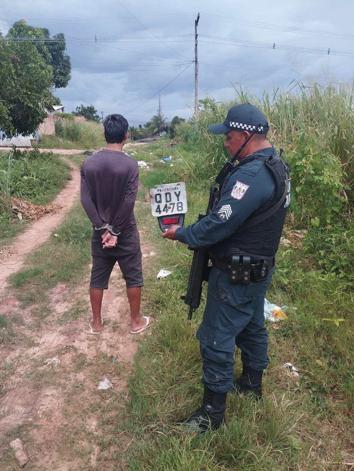 Logo apos informações colhidas a PM caiu em campo e cepois de contactar o dono da moto que relatou aos policiais trabalhar de pedreiro e teria deixado a motocicleta estacionada entre a nona e décima rua na 7° travessa e na hora de ir embora seu bem não estava mais no local diante da informações a policia iniciou uma saturação e populares informaram que tinham visto um suspeito empurrando uma pop vermelha perto da Celpa, já no local os policiais conseguiram realizar busca no matagal onde foi encontrado um suspeito de nome Victor Gabriel de Oliveira Moura, o mesmo estava fazendo ligação direta na motocicleta e foi preso em flagrante o acusado já tinha tirado a placa e os retrovisores fizemos busca pessoal e foi encontrado uma faca de serra de cozinha um alicate de eletricista logo em seguida fizemos a condução até a delegacia de polícia civil 19° seccional para as medidas cabíveis.