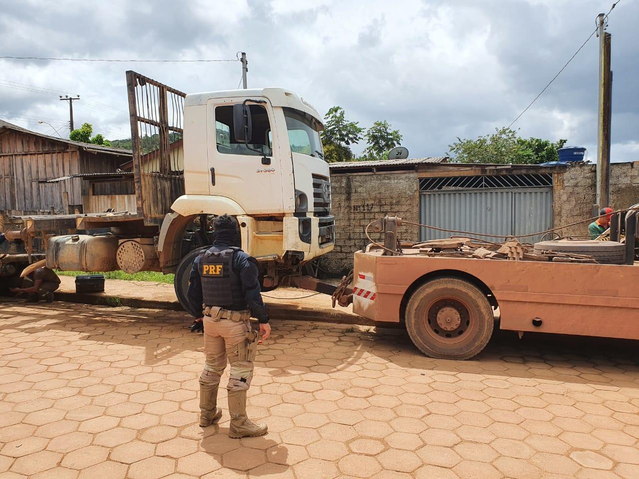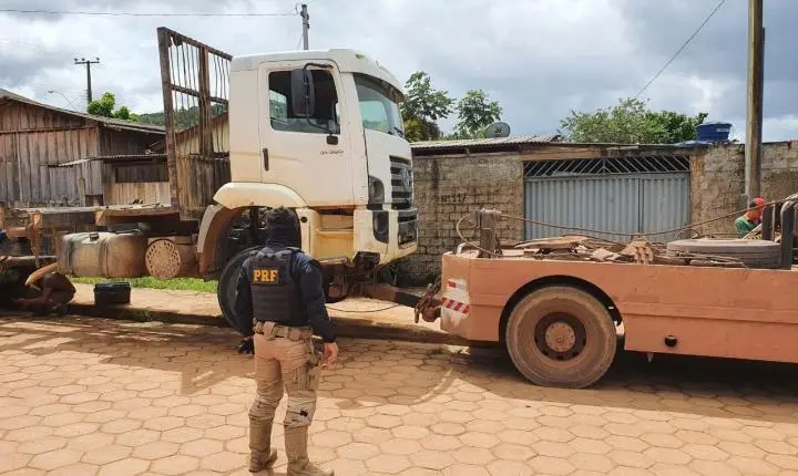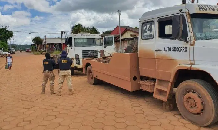 A Polícia Rodoviária Federal, ao realizar abordagem ao veiculo VW/31.320 CNC 6X4,cor branca , sem placas , constatou, ao realizar consulta dos elementos de identificação, que os mesmos estavam adulterados. Após consultas aos sistemas, foi constatado que na verdade se trata do veículo VW/31.320 CNC 6X4,cor branca, de Placas AWX7272, com registro de Restrição Judicial.