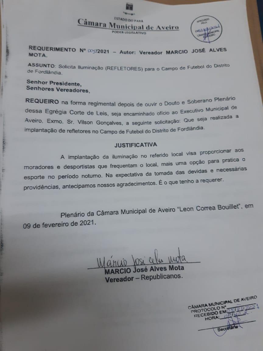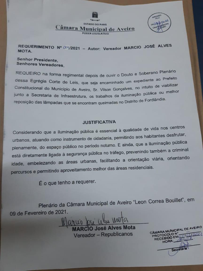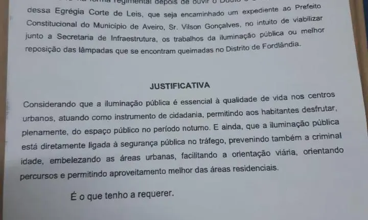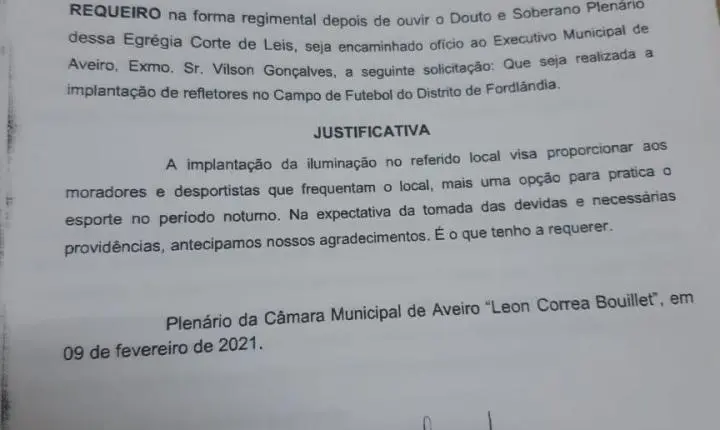 No município de Aveiro vereador Marcinho protocolou no dia (05) de Janeiro (02) requerimentos, e hoje na sessão dia 23 de fevereiro foram aprovados por unanimidade pelos seus colegas vereadores: Iluminação pública em todo o Distrito e iluminação do campo de futebol (refletores), e também levado ao conhecimento do Prefeito outras demandas que serão executadas posteriormente. Prefeito Vilson Gonçalves.